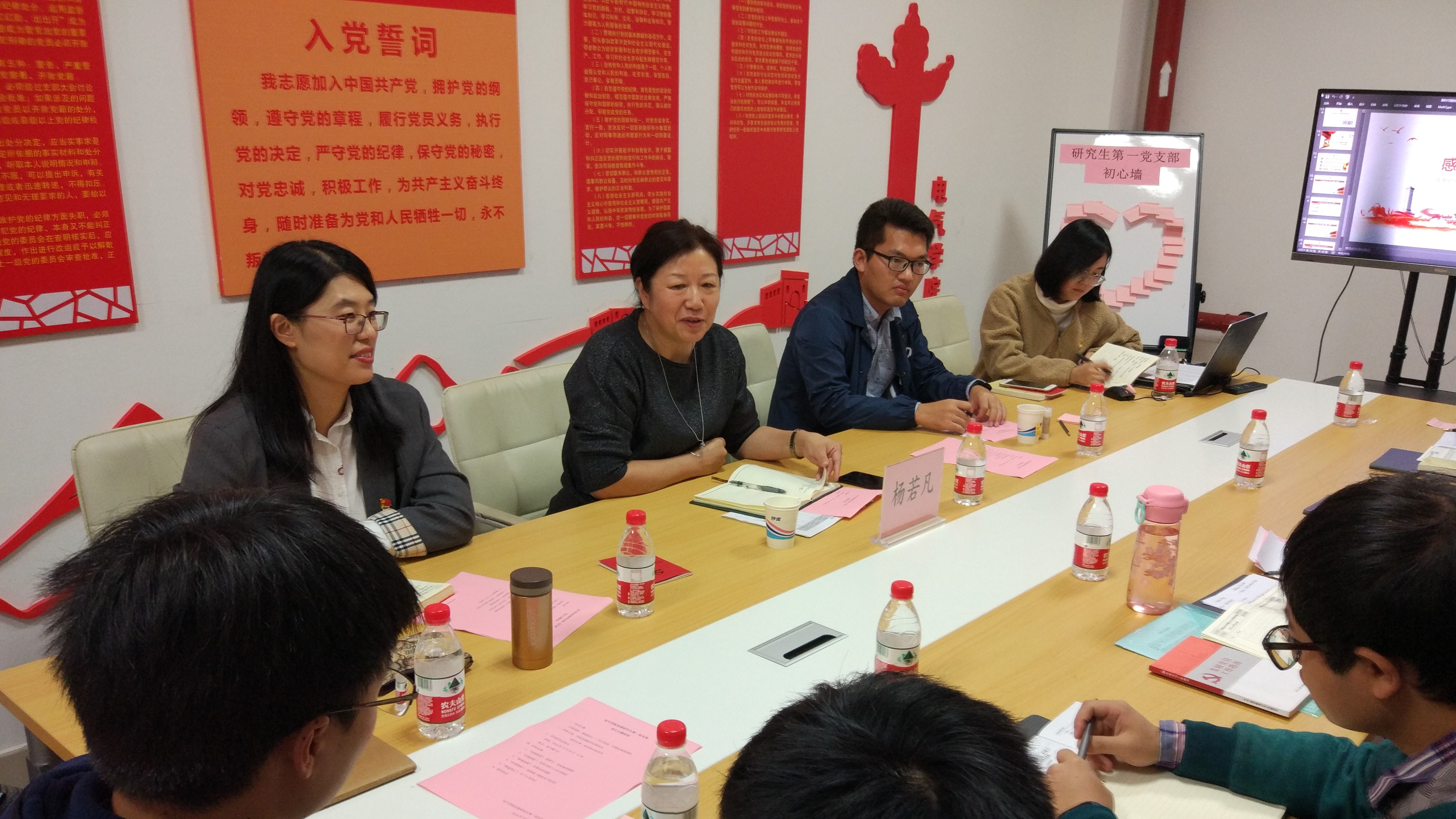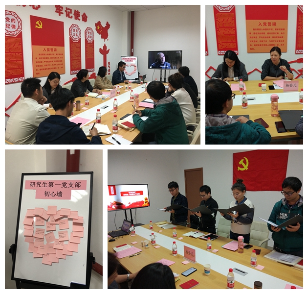 主题党日活动中,大家通过观看的视频方式学习了党员正面典型和反面典型案例,进一步发挥正面典型的激励作用和反面典型的警醒作用;随后,组织委员李鑫带头对照党章中党员的八项义务查找自己的差距;支部书记张鑫带领大家通过党章知识问答的方式,并进一步加深了支部党员对党章的学习与运用;最后在一首《我是共产党员》的诗朗诵激发了在场党员对党的挚爱之情,支部党员纷纷拿起手中的笔在便签纸上写下了自己的入党初心并张贴在“初心墙”上。