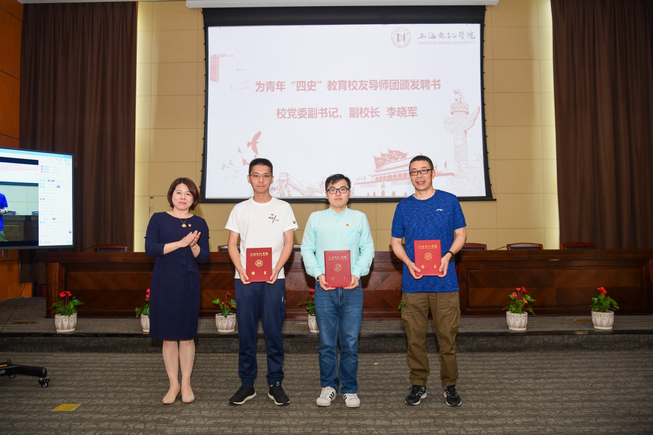 引导学生学好“四史”,少不了优秀的“引路人”,学校邀请经验丰富的老中青校友成立上海电机学院青年学生“四史”教育校友导师团,将“四史”学习中的那些老故事讲给学生听,将中国发展历程中的优秀精神品质传承,经过二级学院校友分会推荐,校友会遴选,首批共有15位校友获聘上海电机学院青年学生“四史”教育校友导师。3位校友导师团代表来到了活动现场,他们分别是82届校友上海建圣机电科技有限公司董事长陈蔚、09届校友现任职于上海彭浦机器厂有限公司徐琛骏、18届校友现任职于上海地铁有限公司贾继祥,校党委副书记李晓军为青年学生“四史”教育校友导师团代表颁发聘书。