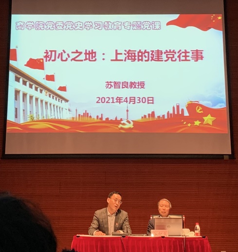 4月30日下午,商学院党委特邀教育部重点研究基地都市文化研究中心主任、上海市委“党史”专家宣讲团成员、上海师范大学教授苏智良于临港校区图书馆报告厅作题为《初心之地:上海的建党往事》专题党课。商学院党委委员、党员师生、入党积极分子、发展对象代表参加,商学院党委书记项军主持。