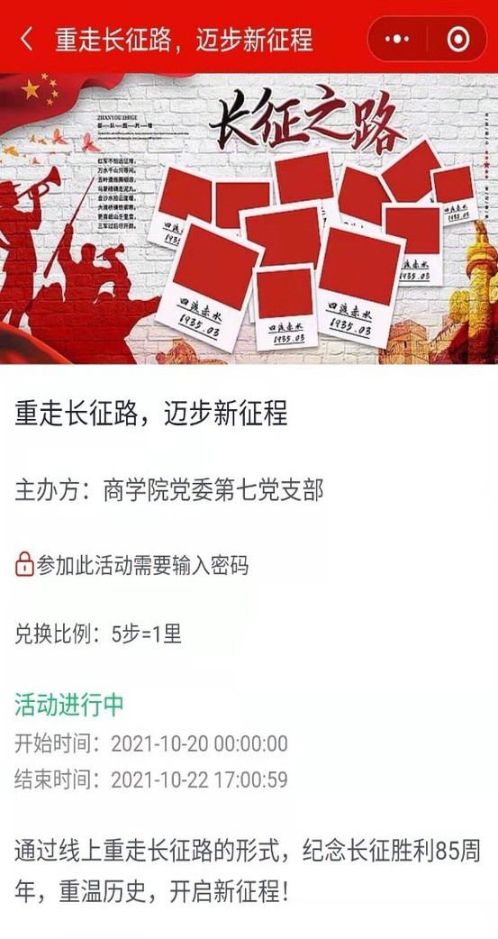 10月22日早上7点30分,机械学院党总支第六党支部全体成员在图书馆前举行了升国旗仪式,并朗诵《七律•长征》。回想长征艰难历程,党员们心中怀着一团火热,为我们伟大祖国取得长征胜利而感到自豪,也为我国现在的山河无恙、日益繁荣而感到自豪。大家表示要立志做好新时代的青年,走好新时代的长征路。从10月20日开始,商学院党委开展“重走长征路,迈步新征程”的线上长征活动,商学院师生党员、发展对象和入党积极分子通过将实际走路步数转化为线上长征里程的方式,体验线上重走长征路,线上打卡长征途径地点,并学习长征相关知识。通过本次活动,同学们对长征的历史有了更深刻的认识,进一步领会了长征精神的深刻内涵,大家纷纷表示要在今后的学习工作中发扬长征精神,不断攻坚克难、勇往直前,走好新时代的长征路。