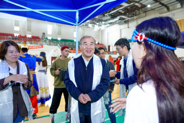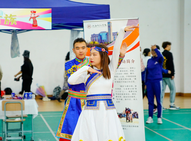 活动现场设置了展示区、体验区和比赛区。展示区有蒙古族、维吾尔族、哈萨克族和藏族同学搭建的民俗文化交流区,向前来参加活动的师生介绍各自民族的风俗习惯、特色服装、民族食品等,邀请师生一起跳起赛乃姆舞、黑走马、萨乌尔登等民族特色舞蹈,呈现了一场又一场的视觉盛宴。体验区设置了抽陀螺、藏式拔河、蒙古摔跤等活动,吸引了众多同学驻足参观和积极体验。比赛区开展了“定点投篮”“排球垫球”和“毽球”等个人项目,以及“袋鼠突进”“旋转足球”“趣味拔河”和“地上篮球”等团体项目。