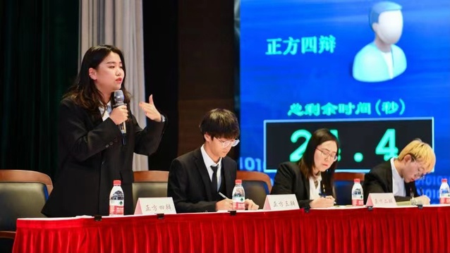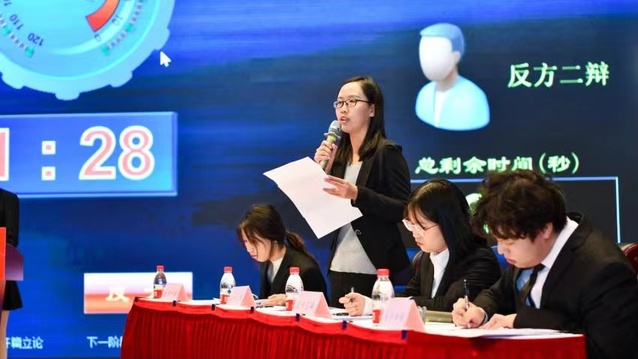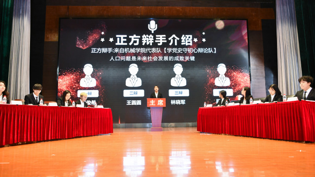 本次辩论赛的辩题是“人口问题是/不是未来社会发展的成败关键”,正方队伍为机械学院代表队(一辩易俊希,二辩王圆圆,三辩林晓军,四辩吴梦圆),反方队伍为高职学院代表队(一辩侯雨欣,二辩昂宇,三辩吴袆旻,四辩施君浩)。比赛分为观点陈述、攻辩、自由辩论、总结陈词四个环节,双方辩手引经据典、滔滔不绝,都为各自论点提供了强有力论证,联手奉献了一场精彩的词锋交汇和智慧碰撞。