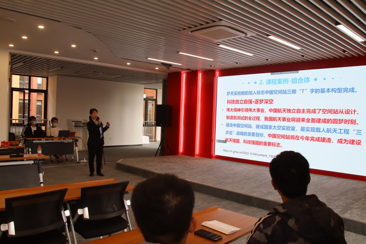 上海电机学院机械学院孙群老师在《工程制图与CAD》课程讲解组合体时,给出了一个特殊的组合体--“天宫二号器箭组合体”,通过分享梦天实验舱成功进入预定轨道的新闻,展示了随“梦天实验舱”一同入轨的上海电机学院实验样品,生动诠释了中国航天人的“逐梦深空,自立自强”,以及电机学院师生的“自强不息,追求卓越”。