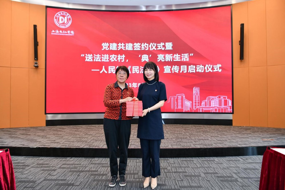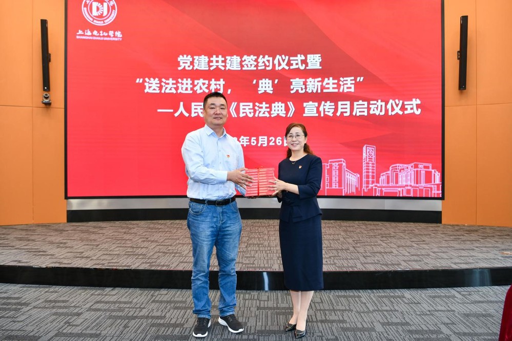 会上,顾建伟代表马克思主义学院直属党支部、刘春娟代表泥城镇人民村党总支,双方举行了党建共建签约仪式。上海电机学院党委组织部部长吴美华和党委宣传部部长朱成实分别向泥城镇人民村赠送了《民法典》等相关图书资料。