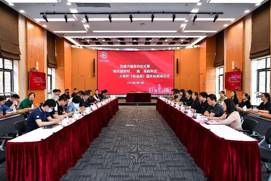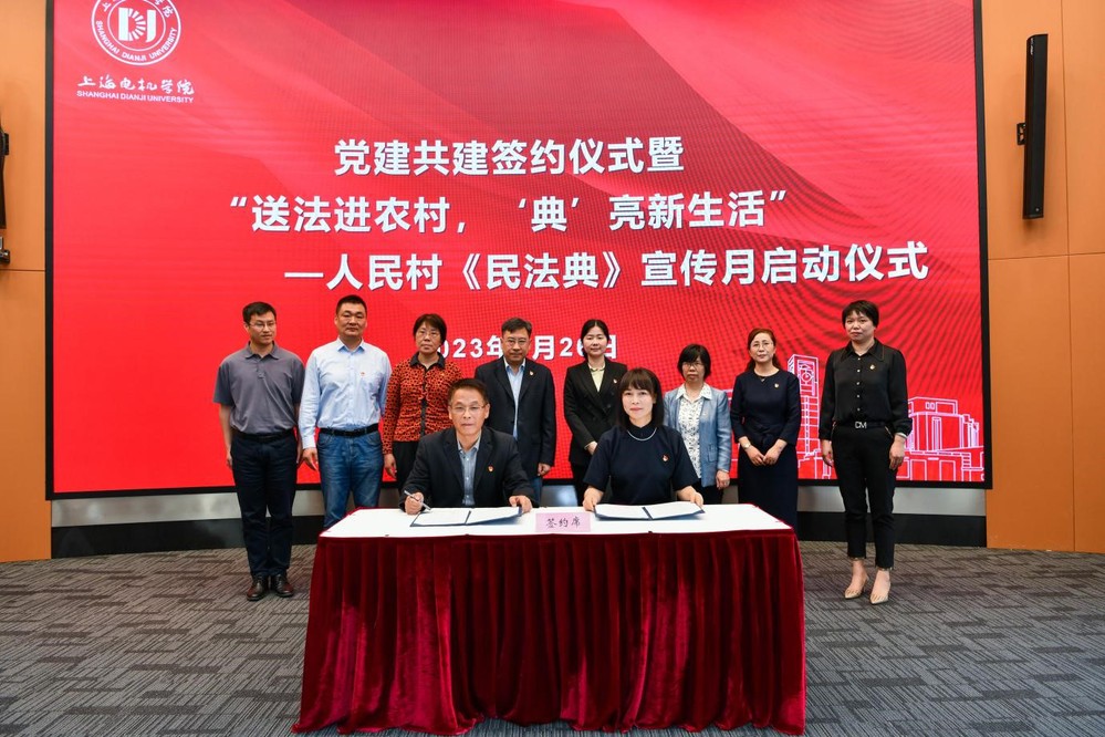 为推动主题教育走深、走实、走心,进一步开创学校党建工作新局面,推动党建引领产教镇深度融合,5月26日上午,在上海电机学院行政楼330会议室,学校与泥城镇开展党建共建签约暨“送法进农村,‘典’亮新生活”《民法典》宣传月启动仪式。上海电机学院党委书记鲁雄刚、泥城镇党委副书记殷明慧出席签约仪式。泥城镇党建服务中心书记蔡卫红,泥城镇人民村党总支书记刘春娟、副书记刘英及泥城镇人民村班子成员和党员代表等共同参加。我校党委组织部部长吴美华、党委宣传部部长朱成实、党委办公室副主任时晓建、团委副书记杨清亮、院长办公室法务综合科科长张杨,以及马克思主义学院班子成员和党员教师代表及校普法社成员等出席活动仪式。会议由马克思主义学院主持工作副院长、直属党支部副书记范冬姣主持。